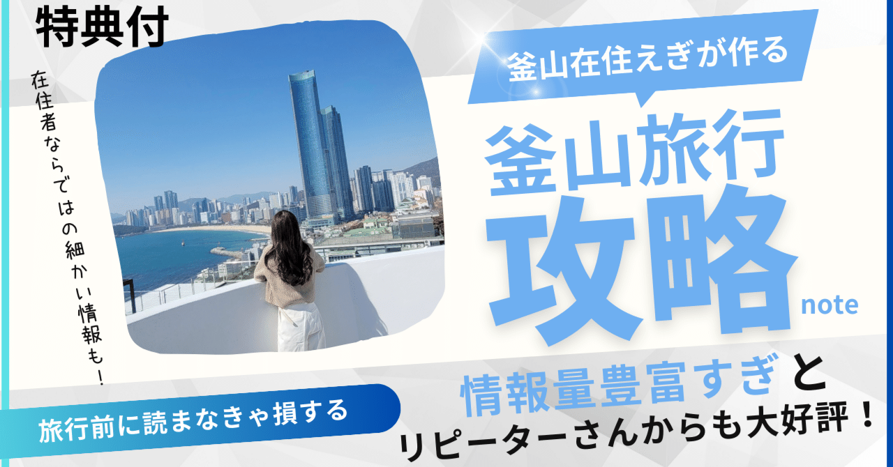【初心者~リピーター】釜山在住7年のえぎが作る釜山旅行攻略ノート|えぎ@韓国個人事業主 3万字突破!! 購入者特典あり!有料ページ最下段をご確認の上、申請ください。 釜山旅行攻略noteの収益はさらに充実したnote作りと@egi_busanインスタグラムの釜山調査...